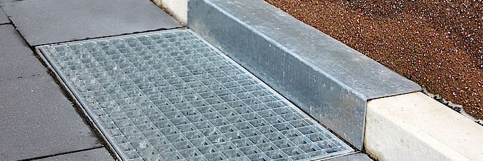 Gitterroste eingelassen in Betonplatten eignen sich besonders gut für Lichtschächte. Trittplatten im Eingangsbereich sind besonders praktisch zum Abfangen von Schmutz.